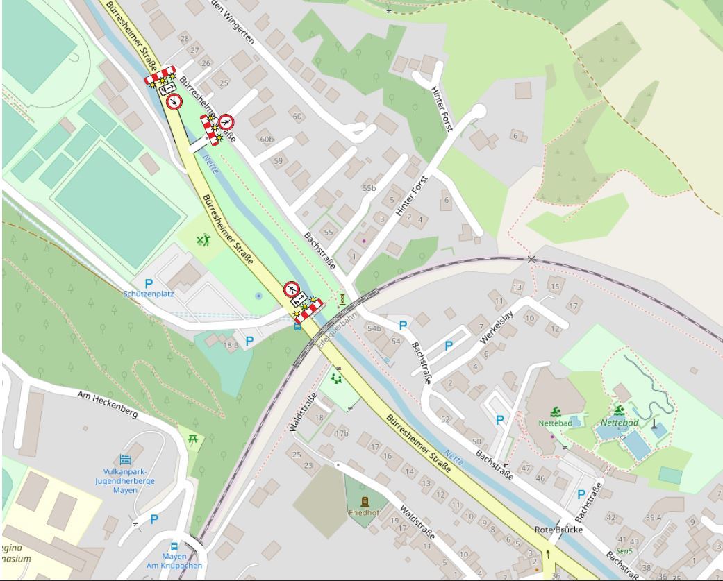 In der Zeit vom 21. bis voraussichtlich 24. Februar sind mit den Arbeiten auch Einschränkungen für den Verkehr verbunden. Es werden Halteverbote in den o.g. Straßen ausgeschildert. Außerdem muss während der Baumfällarbeiten im Bereich des Bachlaufes jeweils eine halbseitige Sperrung der Fahrbahn erfolgen. Der Verkehr wird über eine Ampelanlage geregelt. Gesperrt werden muss kurzfristig auch die Zufahrt zur Waldstraße über die Bürresheimer Straße.